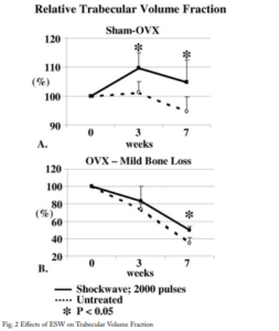 Discussion: A single treatment of 2000 pulses resulted in enhanced trabecular bone formation in sham-ovariectomized rats. The bone formation was only seen in the cancellous bone, which suggests that shockwave therapy influences bone remodeling and is therefore most effective in regions with a high remodeling rate. Cortical bone remodeling is almost absent in normal rats. The beneficial effect on trabecular volume fraction was also seen in rats that were shockwaved 3 weeks after OVX. However in rats that were treated 10 weeks after OVX no effect of shockwave was found. This suggests that ESW affects bone remodeling and causes effects in existing bone structures, but cannot induce de novo bone formation. Because bone structures are still seen in the marrow cavity of patients suffering severe osteoporosis, ESW might be able to induce bone formation in these patients.